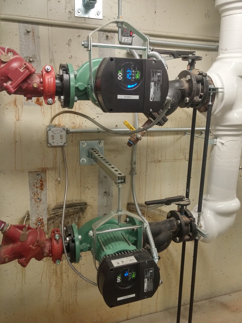 Another photo from the Barnes ANGB showing the pumps in building 55, two of which are new ECM. The in-floor radiant heating pumps stayed.