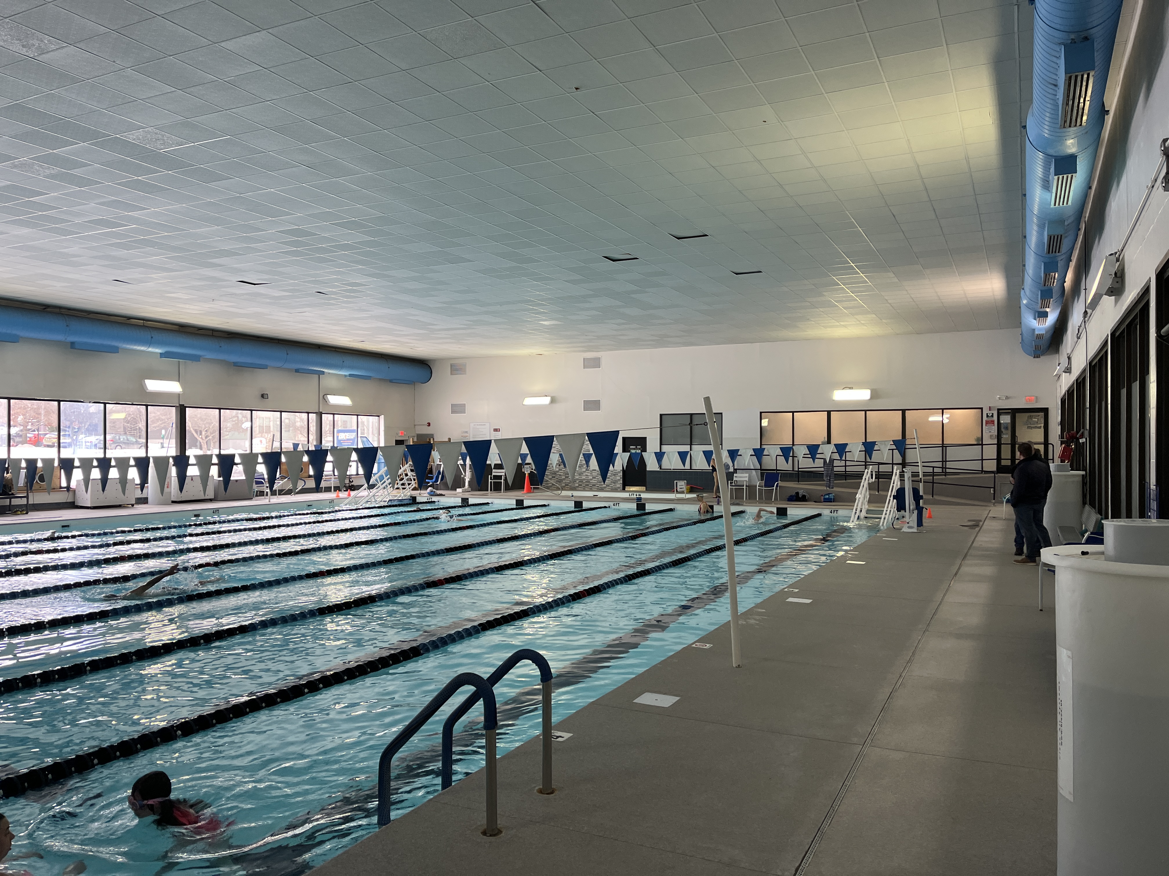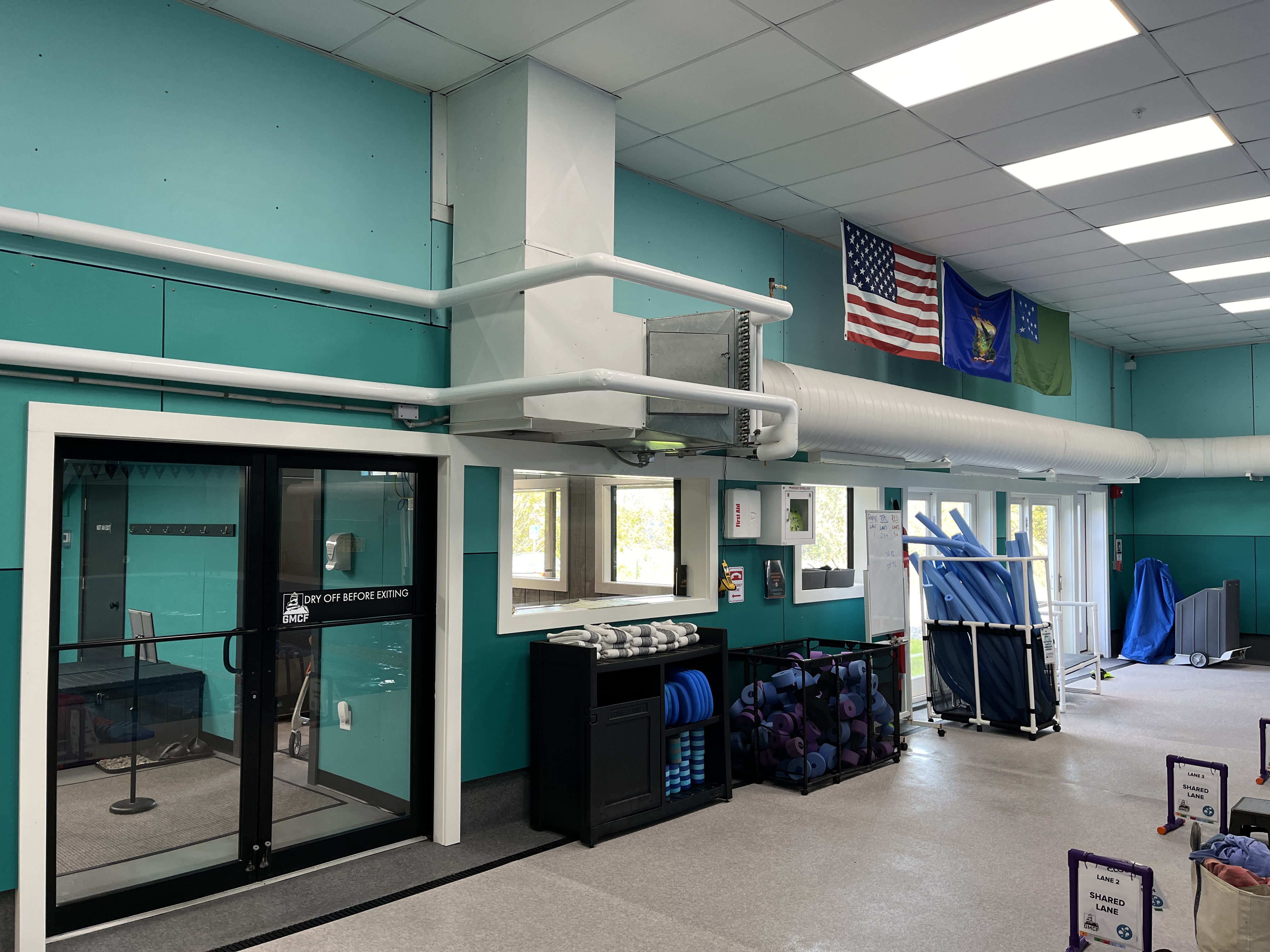 I designed a new outdoor mounted AHU that feeds this existing ductwork to condition the pool air. Temperature, Humidity, and Air Changes are all very critical to keeping people comfortable and chloramine fumes to a minimum.